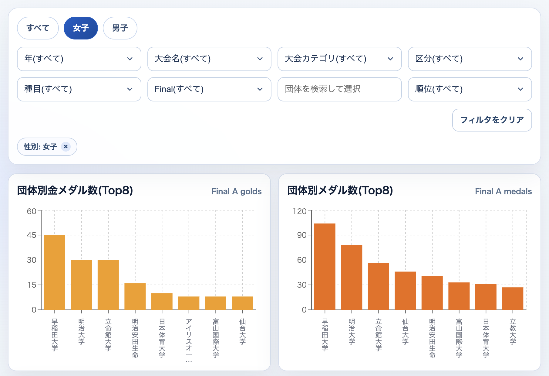 団体別の金メダル数・メダル数をグラフで確認し、勢力図の変化を把握。